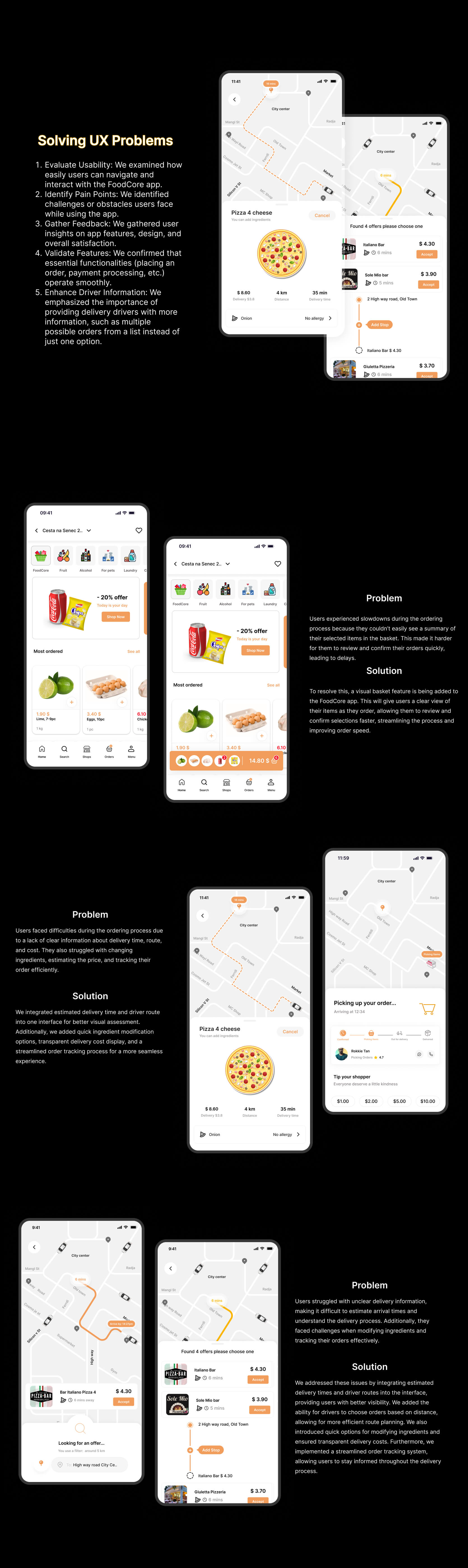 FoodCore is a comprehensive B2C/B2B delivery platform that connects businesses and consumers with delivery partners. The project focused on improving the user experience for all stakeholders: businesses that rely on timely deliveries, consumers seeking convenient shopping, and delivery drivers who need an intuitive, easy-to-navigate interface. By optimizing usability, reliability, and efficiency, the app creates seamless interactions across the entire delivery ecosystem.