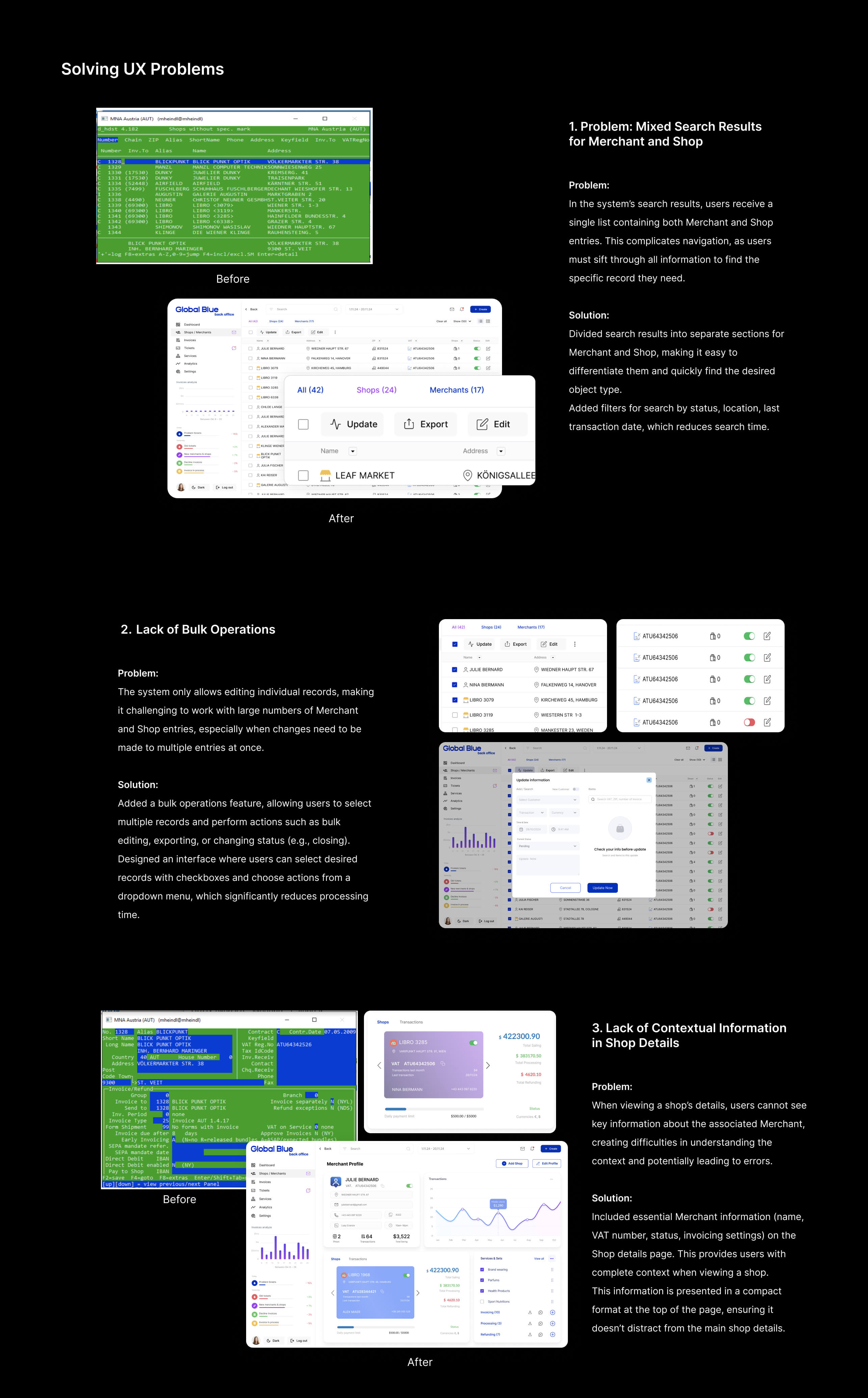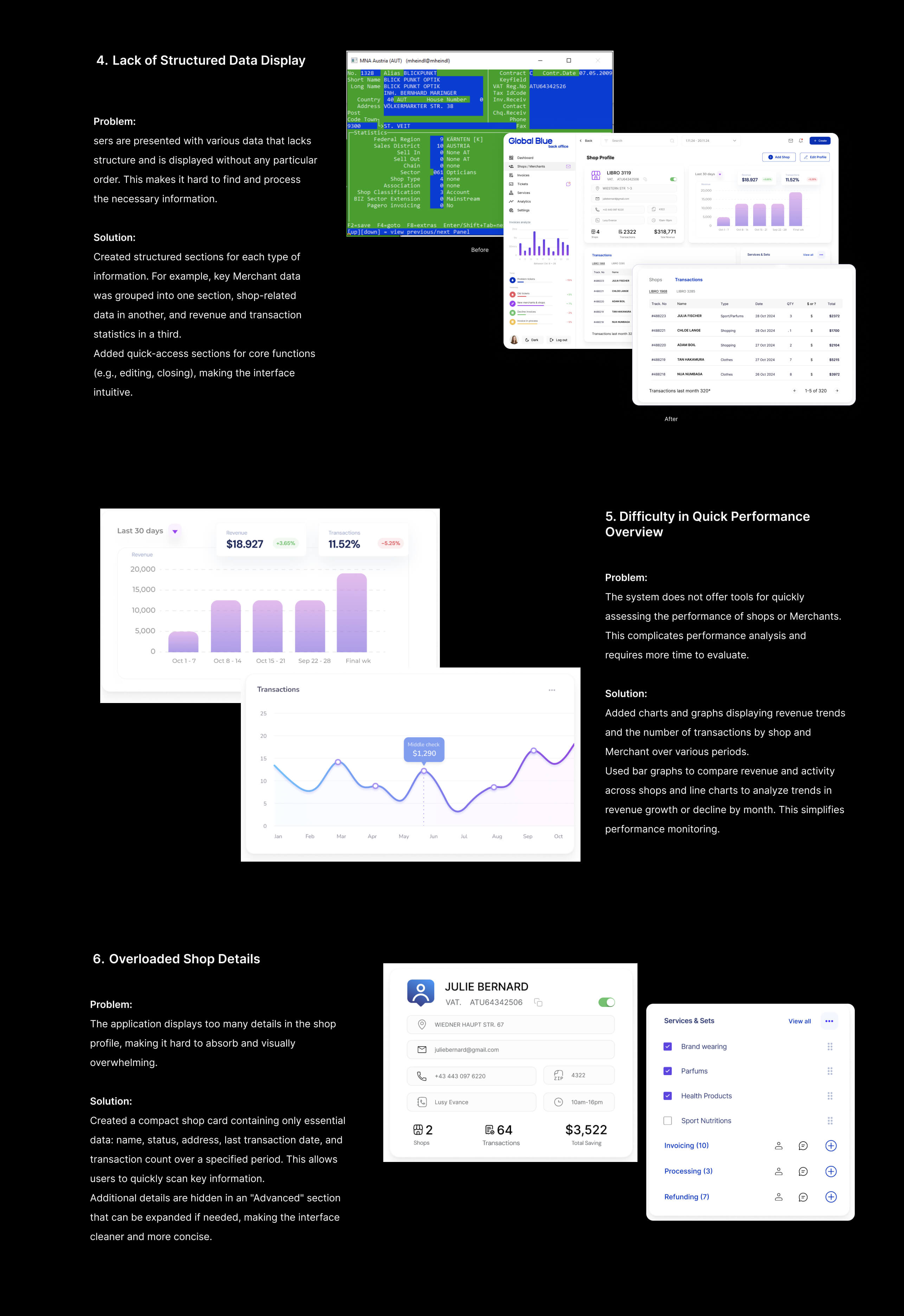 Led the redesign of Global Blue's legacy back-office system, focusing on improving the management of merchants and shops in their tax-free shopping services. The project aimed to modernize the interface while enhancing operational efficiency and user experience.